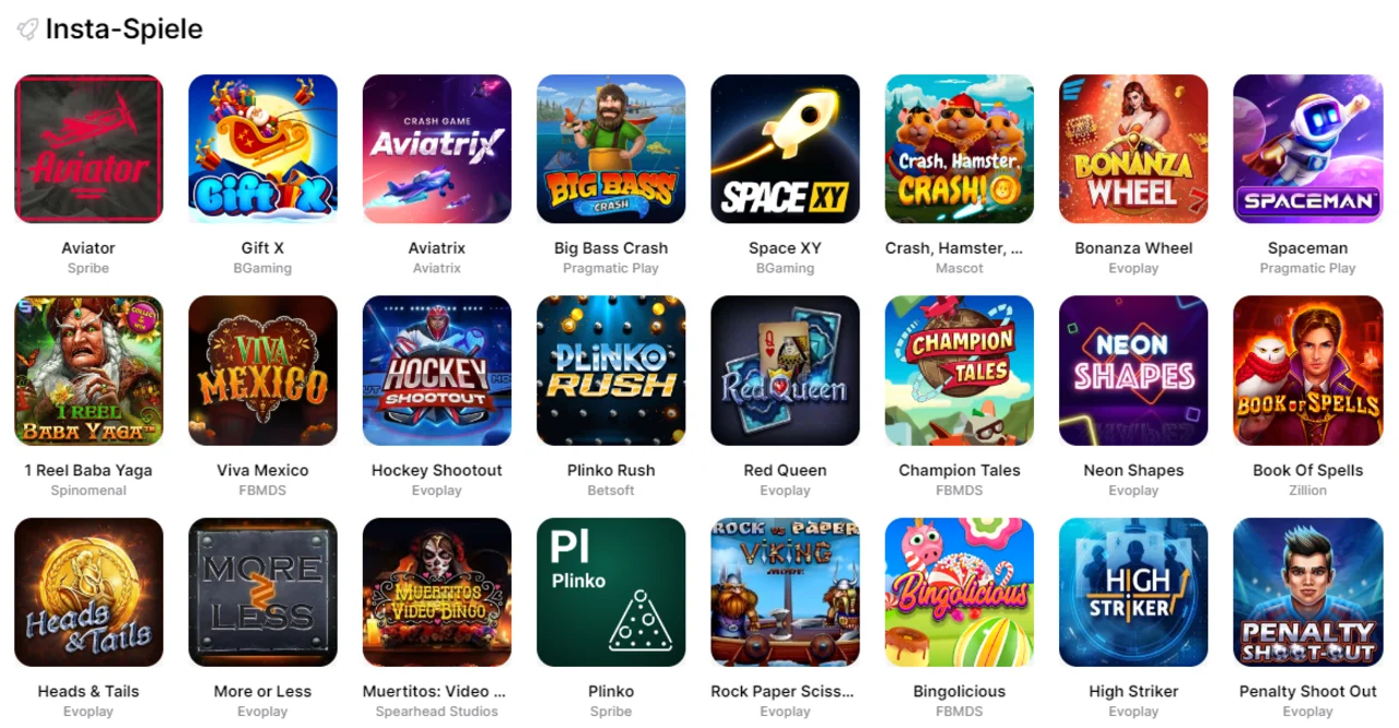 Das wohl bekannteste Instant-Spiel ist Aviator von Spribe. Dabei macht man seinen Einsatz und folgt einem Flugzeug, das durch eine bergige Landschaft fliegt und dabei jederzeit abstürzen kann. Solange das Flugzeug in der Luft bleibt, kann man jederzeit aussteigen und sich seinen Gewinn auszahlen lassen, doch wenn es abstürzt, ehe man sich seinen Gewinn geholt hat, ist der Einsatz verloren. Es gibt noch eine Reihe an anderen Instantspielen im HitnSpin Casino, bei denen man ähnlich innovative Spielweisen für sich entdecken kann.